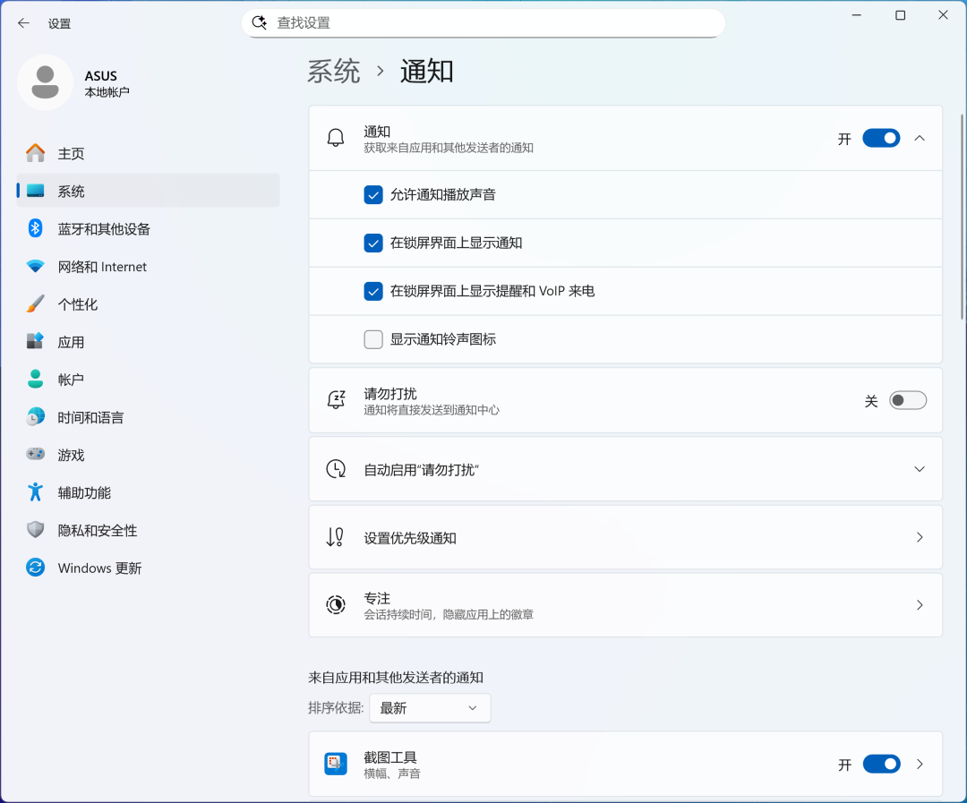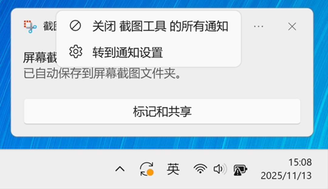 关闭通知后,截图后任务栏右下角将不再显示弹窗。若需重新打开,请至【开始—设置—系统—通知—截图工具】中重新开启。
