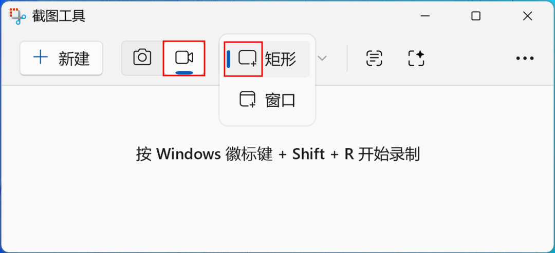 点击【录制】图标,然后点击【矩形】图标选择捕获矩形、窗口视频。