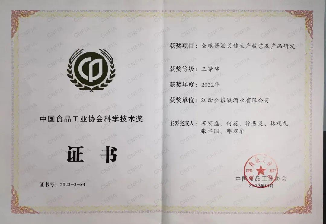 2023年11月30日,全国食品工业科技进步工作会议暨中国食品工业协会科学技术颁奖大会在南京举行。会上隆重颁发了2023“中国食品工业协会科学技术奖”,江西全粮液酒业有限公司呈报的攻关项目成果“全粮酱酒关键生产技艺及产品研发”荣获中国食品工业协会科学技术奖三等奖;公司省级白酒资深评委、质量部部长苏宏盛荣获全国食品工业科技创新杰出人才称号。该奖项是国家科技部批准设立的中国食品行业科技含量极高的荣誉。