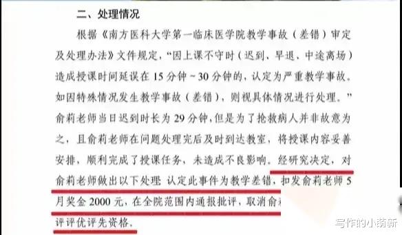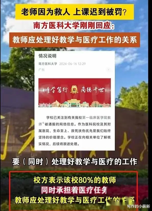 最近,一则关于南方医科大学一位教师因抢救患儿迟到29分钟遭到学校通报批评扣钱取消评优资格的新闻引起了热议。据报道,该名教师名叫俞莉,是一名兼具医生和教师双重身份的人才,她因在医院抢救患儿时迟到29分钟,被学校认定为教学差错,遭到了通报批评、扣钱和取消评优资格的处罚。