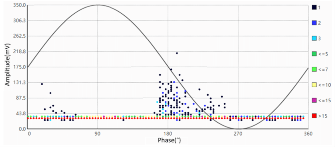 相分辨局部放电图和相分辨脉冲序列图是局部放电测试或检测系统需要测试的两种典型图形。相分辨局部放电图显示了相对于交流电周期360度的局部放电活动。随着电力系统上主电压随时间升高和降低,施加在每个缺陷上的电压也随之升降,这导致缺陷仅在特定的时间和幅度下放电。这就形成了相分辨局部放电图。图5显示了一个局部放电的相分辨局部放电图。不同颜色代表在特定相位角和幅度发生的局部放电事件数量。水平X轴是被测电力系统的相位角,垂直Y轴是局部放电脉冲的幅度: