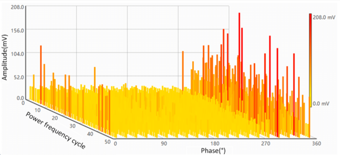 相分辨脉冲序列图是一种三维图(见图6)。Z轴代表从0到50的工频周期,X轴代表从0到360度的相位,Y轴代表放电幅度:
