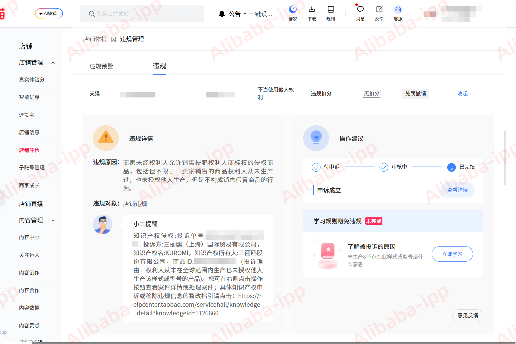 知识产权名称:KUROMI违规平台:天猫知识产权所有人:三丽鸥股份有限公司违规类型:商标权侵权理由:商品投诉知识产权编号