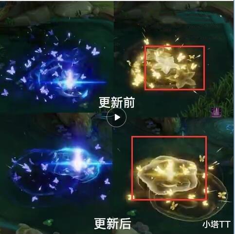 首先是大家发现在优化过后,两款皮肤的被动效果都变了,原本只是一个被动的图案,现在增加了一个扩散的动画效果。从官方的角度来说,增加效果自然是好事情,你应该感谢我。但从玩家的角度来看,这个扩散动画太丑了,遮住人不说,五角星的效果还丑,如果官方是认真地想优化建议再动动脑子。