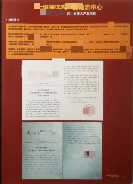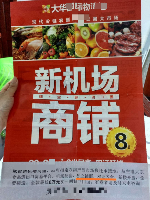 2014年前后,陈先生关注到“某华物流港”项目。开发商出示的上级文件及宣传手册显示,该项目是上级重点招商引资项目,定位“西南最大30万吨冷链市场”,承诺“独立门面、双证齐全”,并有简阳相关媒体报道加持,宣传中还提及“八里庄冷链搬迁”“检验检疫中心入驻”等配套规划。这份官方背书让当时还是“荒草坡”的地块成为“黄金商铺”,八千余名购房者随之入手,陈先生便是其中之一。
