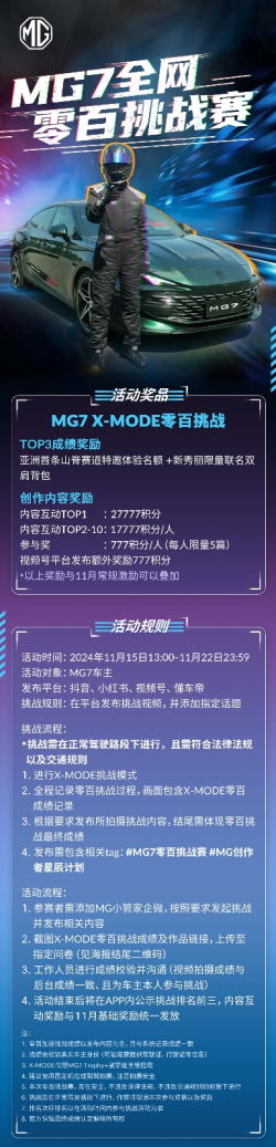 MG7本就底蕴非凡,身为“全球轿跑世家”MG的扛鼎之作,其零百加速低至6.5S。同时,该车配备mCDC智能可调电控悬架,即便应对碎石烂路等复杂路况也能轻松驾驭;E-LSD电子限滑差速器可避免打滑与横摆;加之X-Mode超级玩家模式,为用户带来更为纯粹的驾驶乐趣。MG聚焦用户热衷的X-Mode超级玩家模式,重磅推出MG7全网零百挑战赛活动,即日起,用户可通过抖音、小红书等平台参与挑战,获取大额积分奖励。赛事成绩榜单的前三名优胜者,还将获得亚洲首条山脊赛道的特邀体验名额,在专业赛道上体验飞驰人生。
