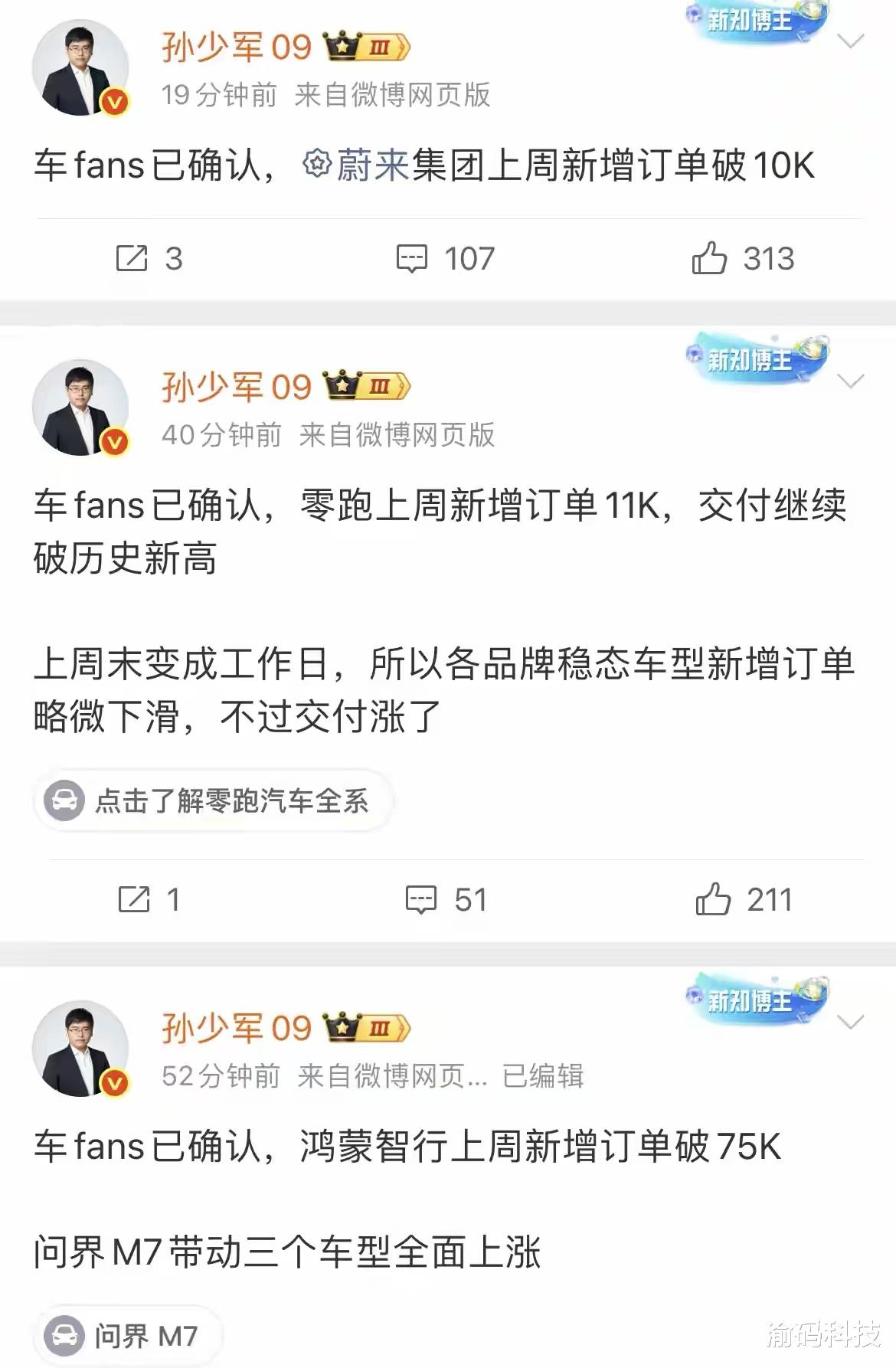 但现实是:当鸿蒙智行已进入“周销7万+”的新维度,蔚来与零跑的“破万”虽值得肯定,却更像是在奋力追赶一场已经拉开身位的赛跑。