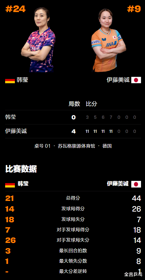 4/4区:伊藤美诚4-0韩莹:11-3、11-5、11-6、11-7。
