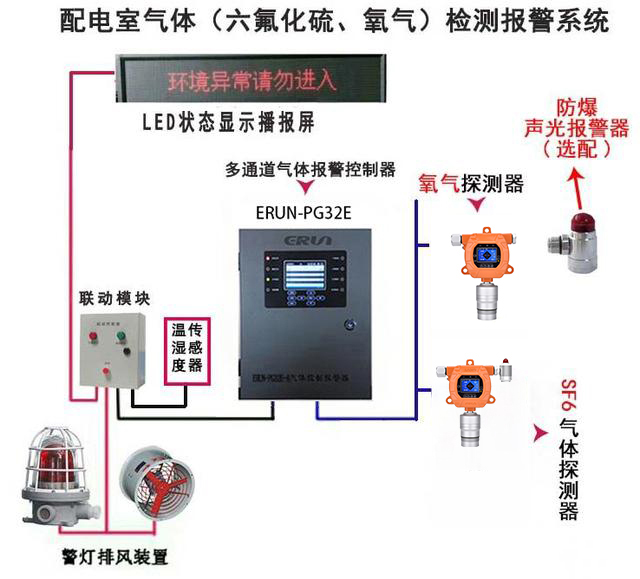该系统通过固定式传感器,对运行环境中SF6气体浓度进行24小时连续在线监测,并在异常情况下触发声光报警及联动控制。在电力行业,SF6被广泛用作绝缘和灭弧介质,但其密度约为空气的 5.1 倍,一旦泄漏易在低洼区域聚集,存在明显安全隐患。