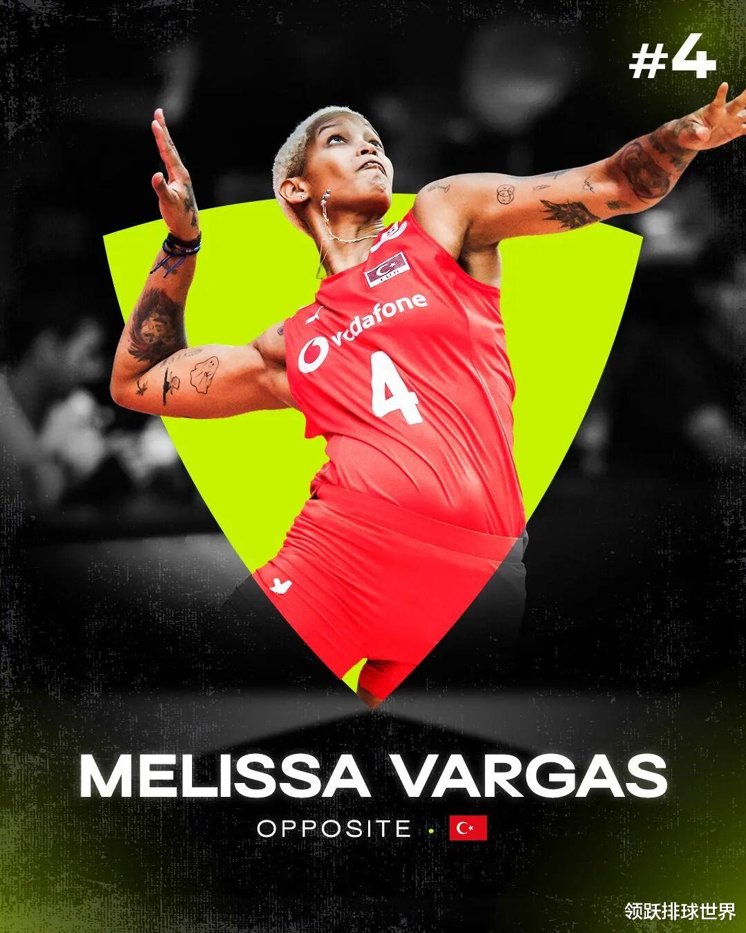 第4名:梅丽莎·瓦尔加斯(Melissa Vargas),瓦尔加斯从VNL第二周回归便强势接管比赛节奏,在世锦赛更是一骑绝尘,荣膺最佳接应、得分王、发球王三大称号。作为土耳其女排的进攻支柱,她用行动证明自己是2025年最值得信赖的火力点。