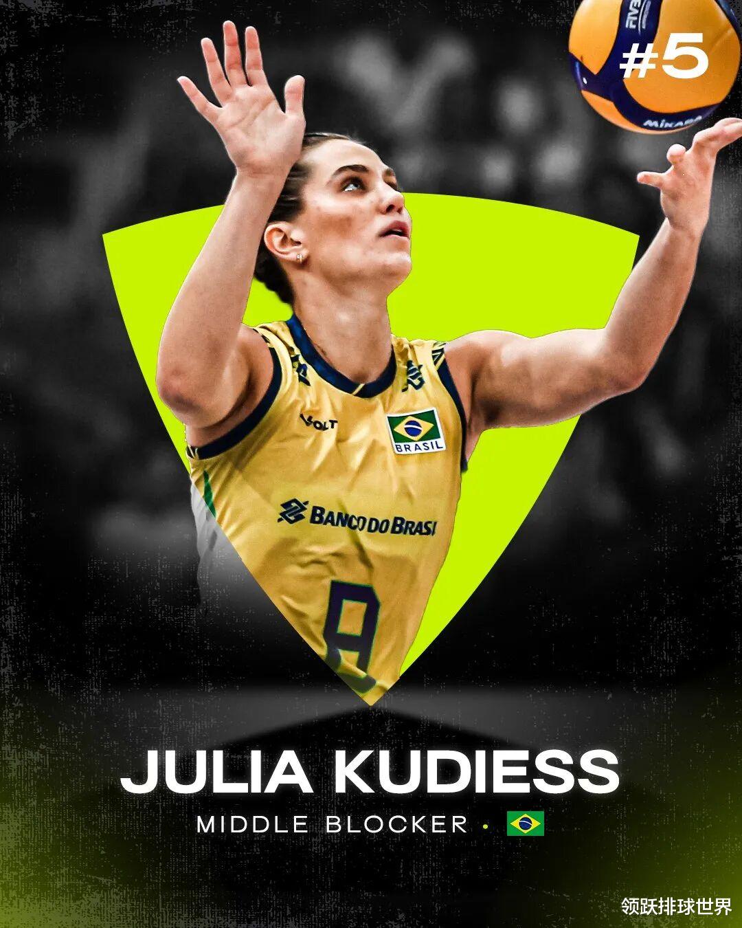 第5名:朱莉娅·库迪斯(Julia Kudiess),22岁的库迪斯是2025年全球最具统治力的副攻,她在VNL与世锦赛中均斩获最佳拦网手,在巴西超级联赛中也以稳定高效的表现居榜首,不仅如此,她的快攻滑步迅猛,攻击效率惊人,在年轻一代中堪称领军者,是未来十年的巴西核心之一。