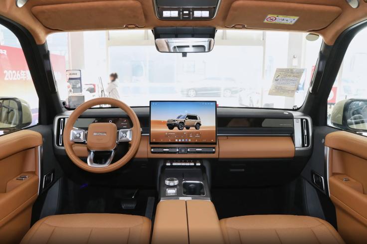 不光是外观设计有“豪华硬派越野SUV”的味道,iCAR V27的内饰设计也融合了一些复古硬派越野车的气息。内饰整体延续了简洁干练的家族风格,针对细节进行了一些小的调整。中控台区域,新车采用悬浮式中控屏设计,搭配下方空调出风口、物理按键等设计,突出了硬派越野车硬朗务实的产品属性。同时为了迎合当前年轻消费者对座舱智能化的用车需求,新车还会配备手机无线充电面板、驾驶模式旋钮、水杯架等配置,为使用者日常出行提供操作便利。而且来到20万以内这个价位区间,前排座椅加热/通风/按摩等配置也是不会少的,若能增加前排隔音玻璃配置,相信会取得一部分年轻家庭用户的认可。