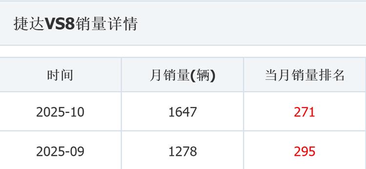 根据公开的销量数据,捷达VS8在今年9月销量是1278辆,10月销量是1647辆,虽然相较前一个月成绩略有提升,但放在整个SUV市场上依然只算是冷门车型。一般在上市初期就遇冷的产品,后续再想实现销量逆袭难度就更大了,那么究竟为啥捷达VS8不受待见?