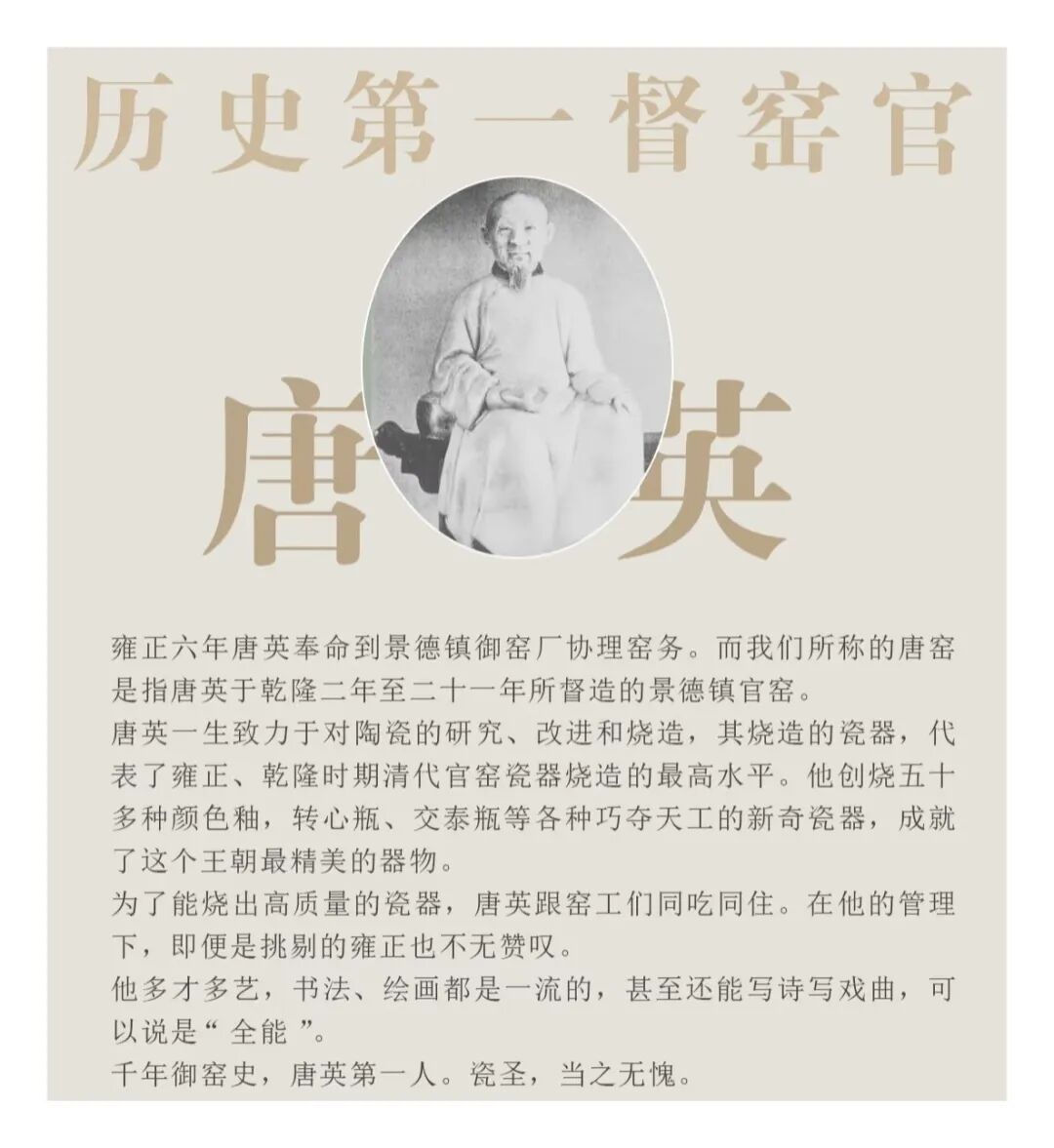 他既非哪个朝代的皇帝,也不是供奉在庙堂的名家大腕,而是一位叫唐英的督陶官。