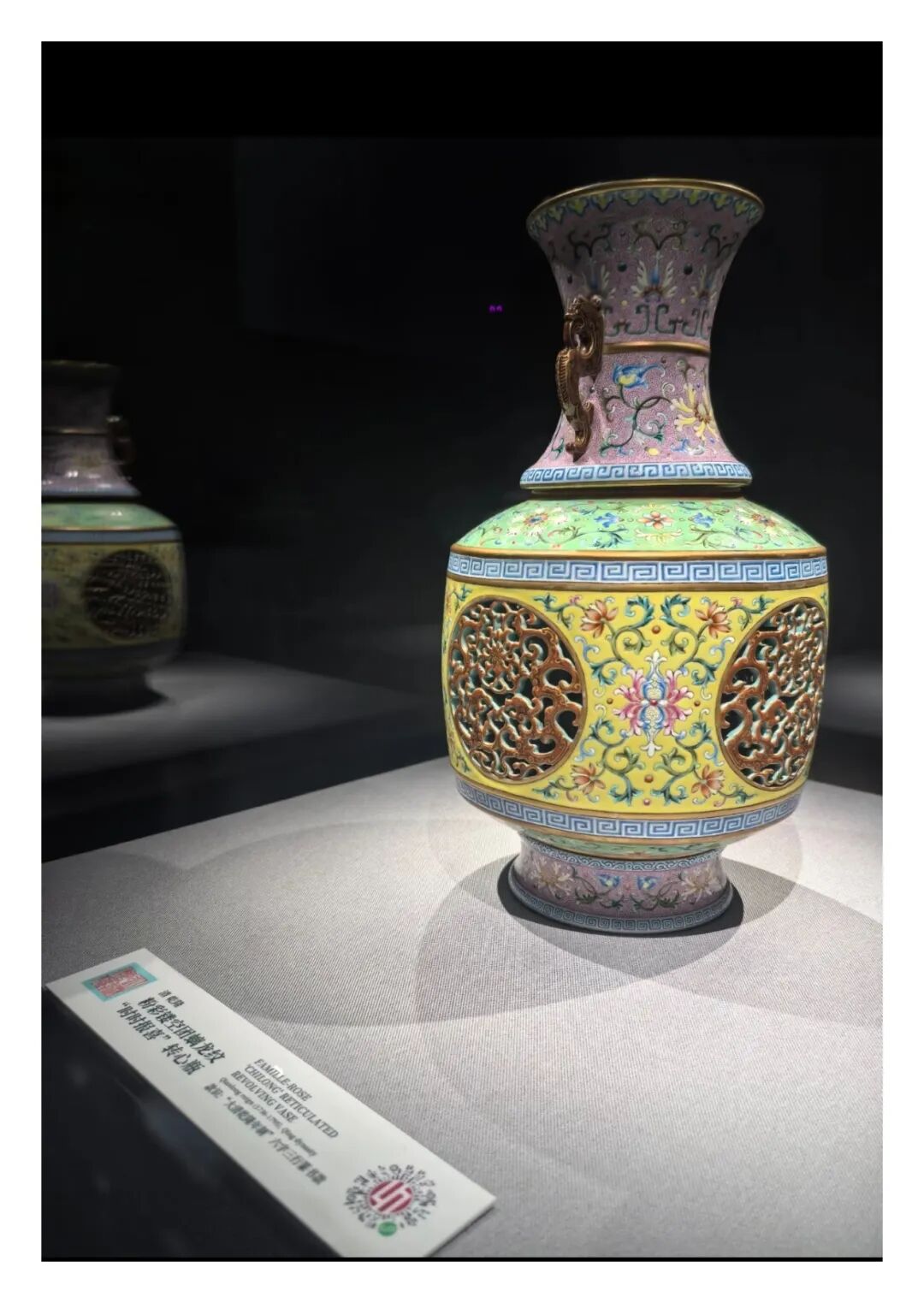 外面的瓶子绘着花,里面的瓶子也绘着花,转动里面的瓶子,外面的花纹透过镂空之处显现出不同画面。