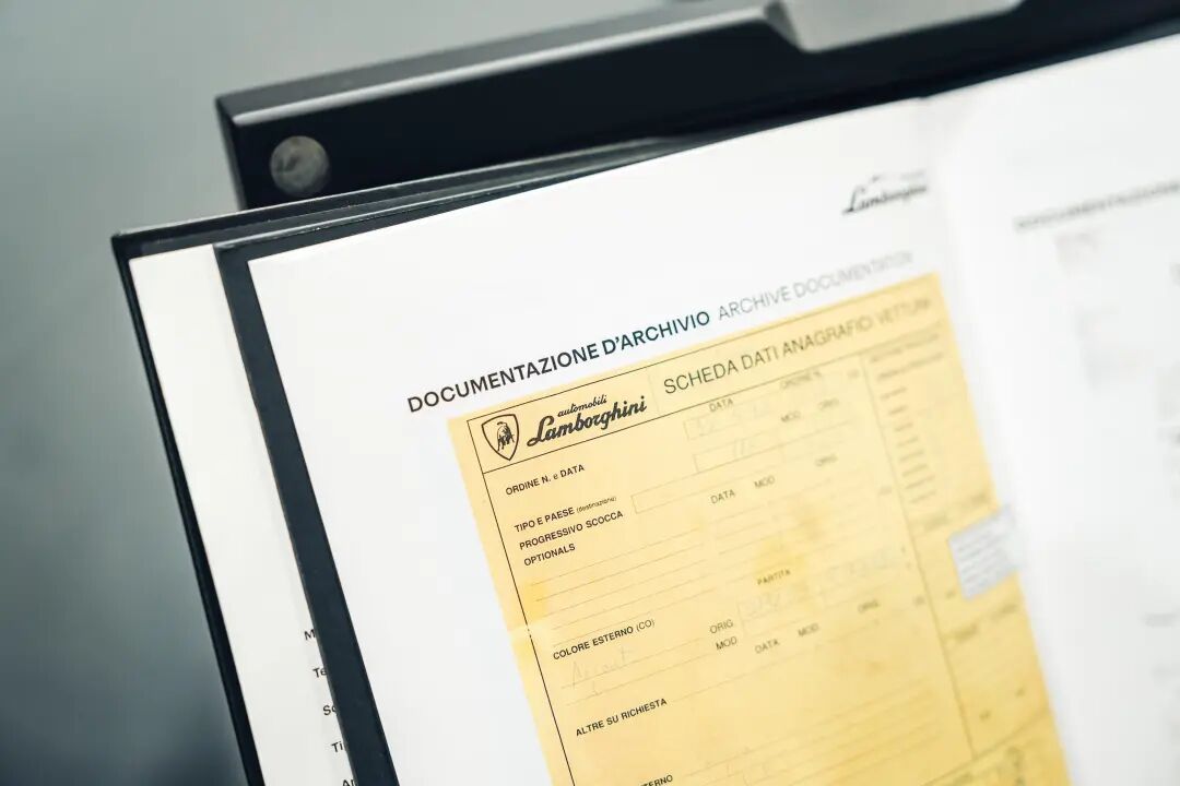 展车旁边是一份1963年的原始1:1技术图纸,展示了其内饰布局研究。这是兰博基尼历史档案中保存的最古老文件,是品牌与Touring车身制造厂合作的珍贵见证,也象征着Polo Storico悉心守护圣亚加塔公司工业与设计遗产的承诺。展区还陈列了多本书籍,阐释Polo Storico提供的两项主要服务——修复与认证,以及从档案中精选的部分物品。