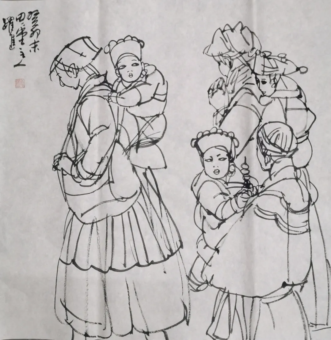 孙先生是一位丹青实力派,画人物法度严谨,画小孩表现出天真活泼,童趣十足,衣裳劲简,彩色柔丽,兼工带写,十八描法尽展娴熟。色彩渲染墨色不碍,层次分明,造型严谨,比例准确,体态自然。他用线条表现身段曼妙,用点睛之笔表现万种风情,面部表情惹人久驻其画,极有神韵,魅力无限。他的技法毫无疵弊,画意又极尽唯美,所以他的人物画从技法上来说有古今永传的法度,从主旨上来说则确立了正确的“人物美”价值观!