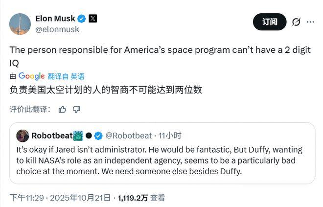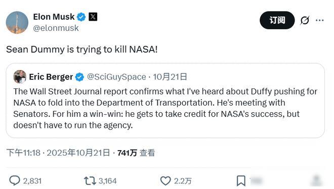马斯克一听就急了,在网上直接管达菲叫傻冒,还拉了个投票问大家爬树局长有没有资格管航天,话是难听,但真不是气这个,他怕的是那笔独家合同保不住,2021年他拿下了二十九亿美金的单子,公司上下全靠这单子活着,现在有人要来分一口,他怎么能不慌。