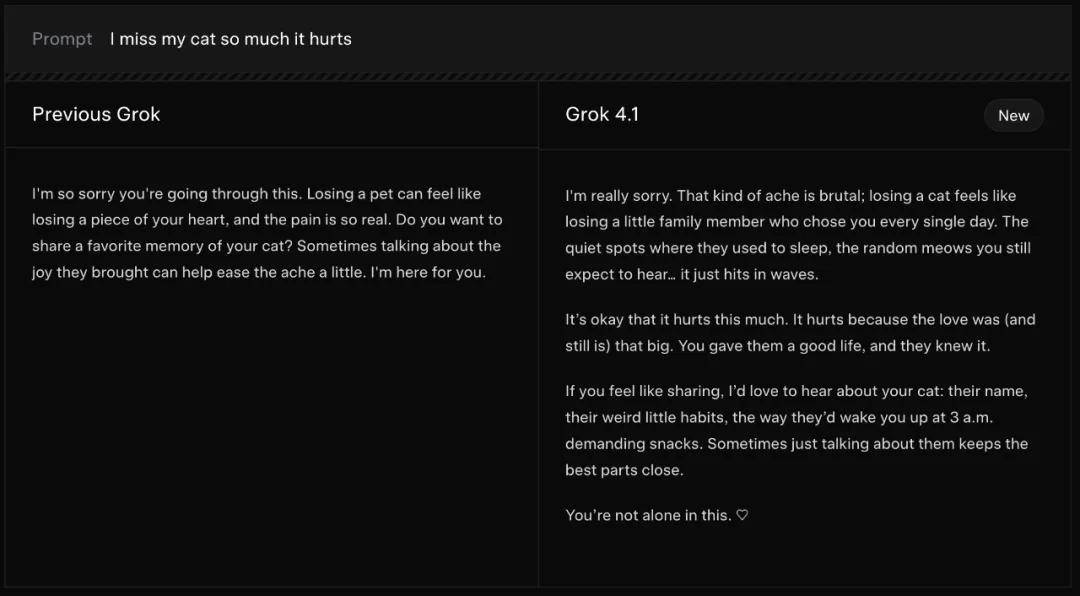 以下示例展示了 Grok 4.1 对情绪类提示的回应方式: