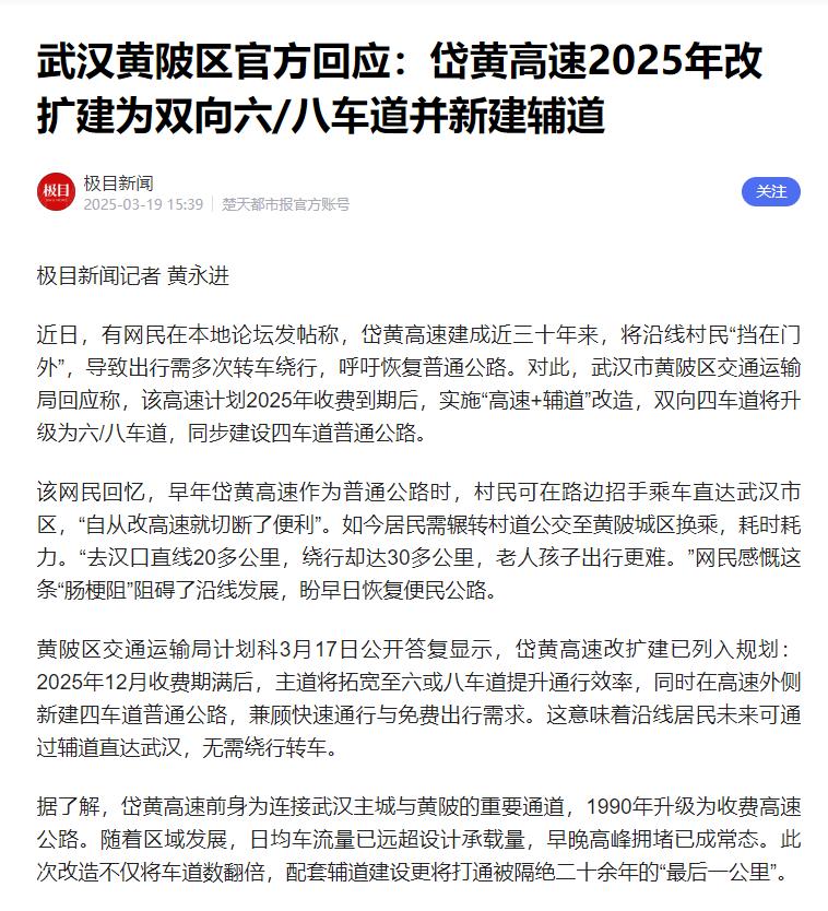 想法是好的,但现实是骨感的。先不说岱黄高速已经和多条高速联网导致收费站难拆除,就说把岱黄改建成文化大道那样的标准,就需要大量的投资,黄陂有钱还好说,要是没钱,就真的有点难了。