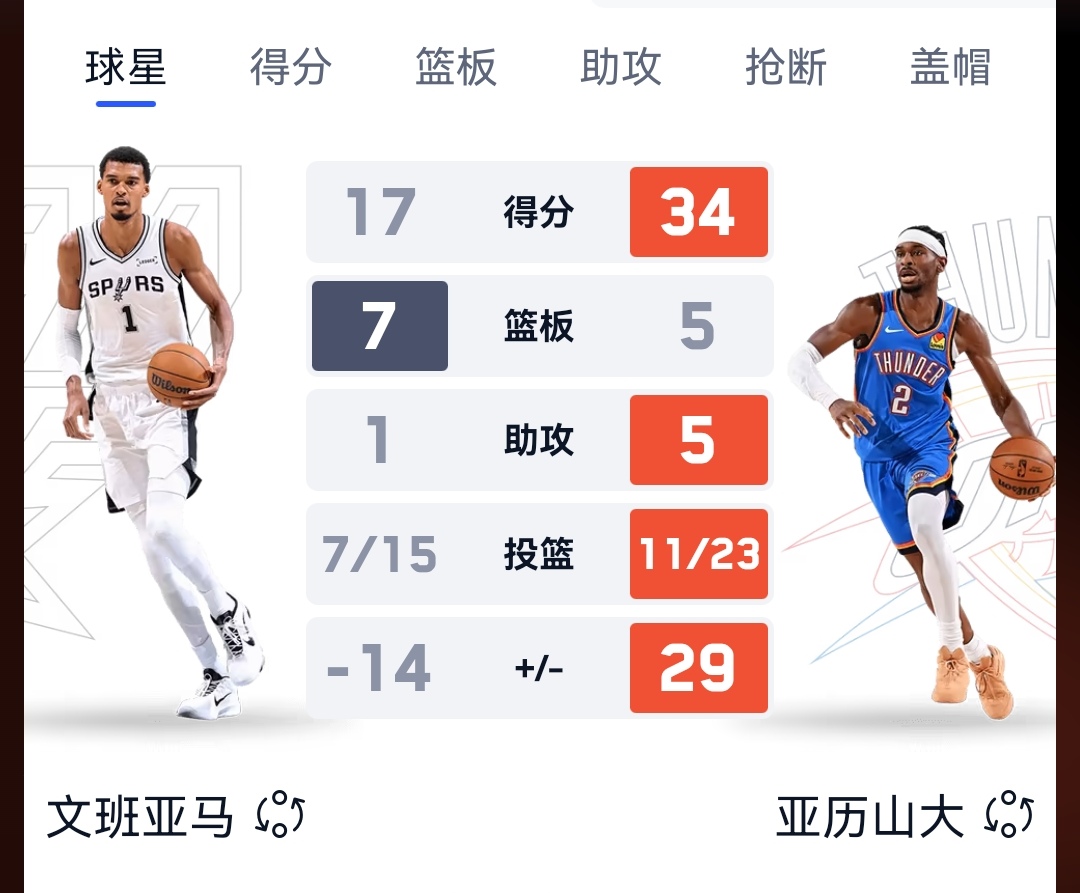 球星对此,文班亚马略逊一筹,正负值-14,亚历山大则是高达+29,雷霆获胜的最大功臣。
