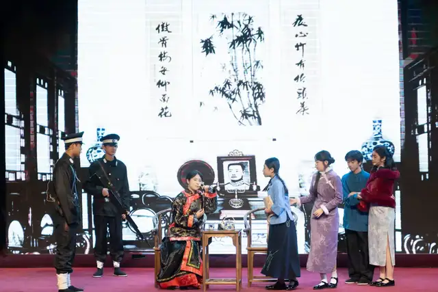 人物剧《一生梅骨为中华》。他是中国京剧艺术的一代宗师,更是以艺报国的民族脊梁。梅兰芳先生用傲骨诠释了 “戏比天大,国比戏大” 的信念,如梅花般傲立风雪的民族气节令人动容。演员以细腻的演绎,展现其在艺术上的极致追求与在民族危难时的铮铮铁骨,诠释了何为“梅骨”、何为“中华魂”,让全体学子体会到了那份跨越岁月的赤诚与担当。