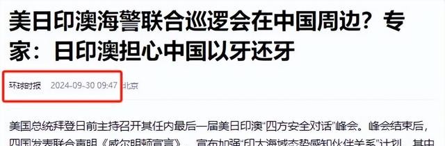 3.环球时报:《美日印澳海警联合巡逻会在中国周边?专家:日印澳担心中国以牙还牙》-2024-9-30