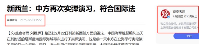 2.观察者网:《新西兰:中方再次实弹演习,符合国际法》-2025-2-23