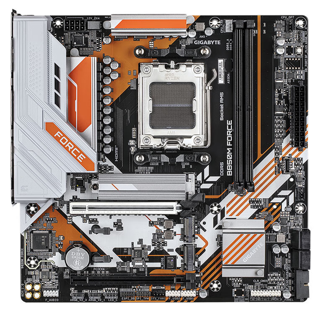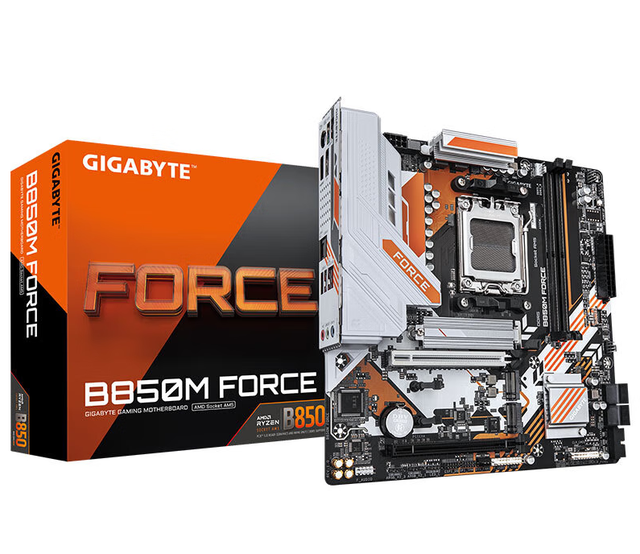 时隔多年,技嘉重新上线了FORCE系列主板,主打的一个性价比。B850M FORCE战鹰橙黑白相间的配色,充满了电竞风格。在用料上这款主板也不错,采用8+2+2相供电,支持X3D Turbo模式,还有AI D5黑科技,可以全力释放你的平台性能。