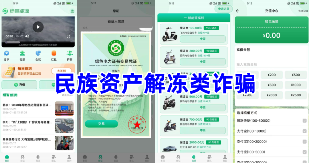 不法分子冒充国家某部门的旗号,打着绿色能源投资的旗号,制作散布涉诈APP,实名注册即可领取绿色电力证书,缴纳相应保证金领取电动车,90天后返还,采用传销模式发展下线,引诱他人参与达到一定人数,可领取相应薪资。