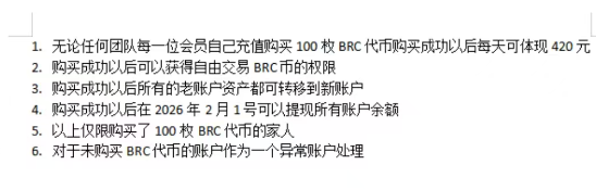 近日,该项目一位“负责人”声称想提现,必须要购买“BRC”虚拟货币,对于为购买虚拟货币的账户,做异常处理,而另一“负责人”声称只需要缴纳2800元进行投资,就可以提现,而且其他团队的负责人都销声匿迹,怀疑最后的收割。