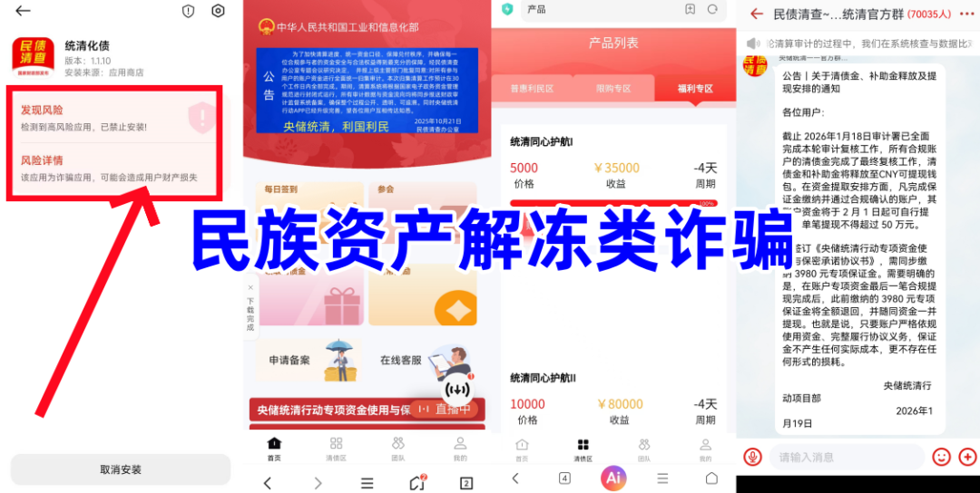 不法分子冒充“工信部”的名义,制作散布涉诈APP,打着给“追梦人”清除债务的名义,实名注册即可获得168万清债金,同时推出“统清同心护航”“央储稳进”“央储清债使命”等高额理财项目实施诈骗。