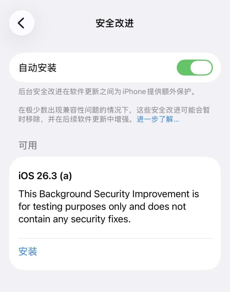 需要进入 iPhone 设置--隐私与安全性--后台安全改进,才能看到 iOS 26.3(a)的更新,然后直接安装即可。