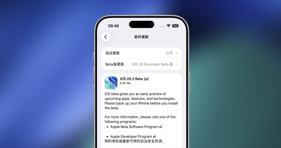 如果你已经更新了 iOS 26.3 Beta 的话,那么建议更新 iOS 26.3 Beta(a),如果还未更新 iOS 26.3 Beta,目前不建议更新。