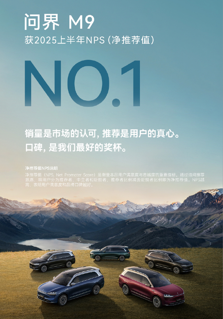 根据杰兰路2024下半年-2025上半年新能源汽车品牌健康度研究显示,问界M9连续两期新能源全车型用户净推荐值第一。