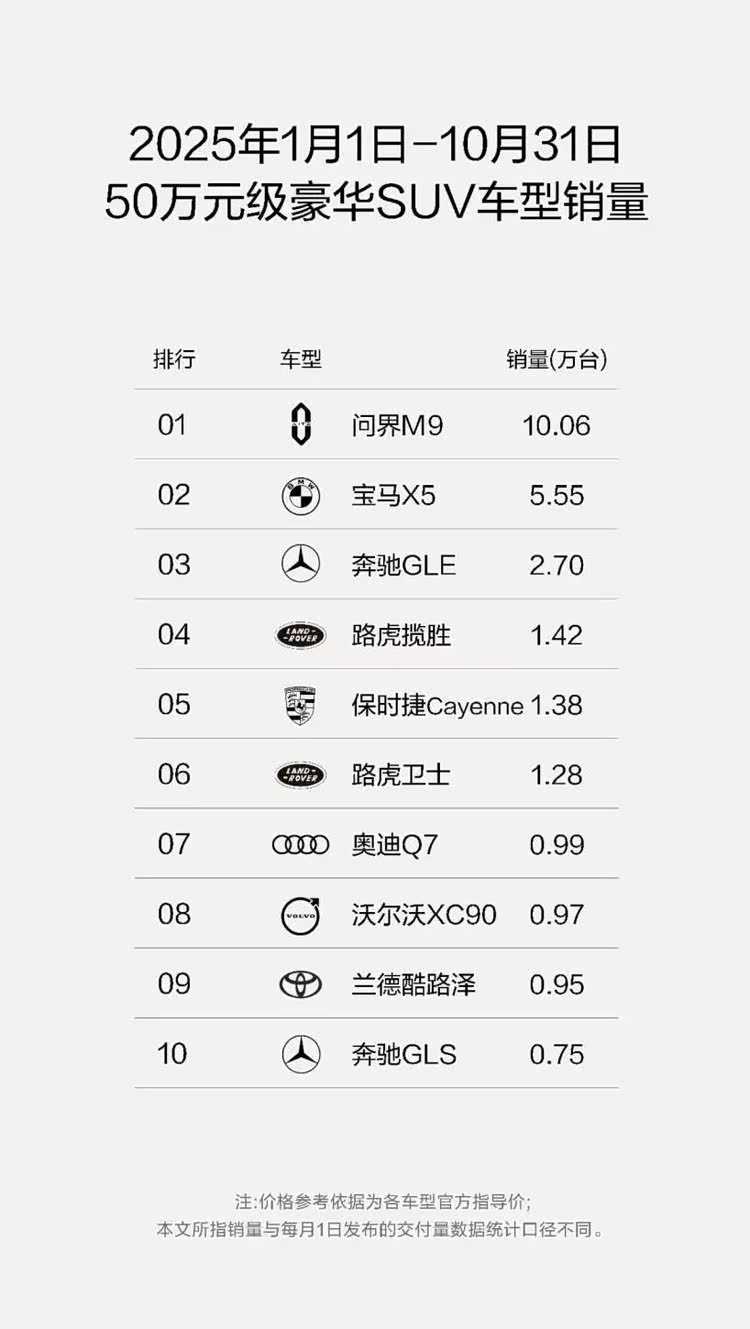 虽然竞争加剧,这一细分市场俨然一片红海。但是根据最新销量数据显示,2025年1月1日-10月31日,问界M9以10.06万台的累计销量,牢牢占据50万元级豪华SUV车型销量榜单第一,上市至今全系累计交付突破26万辆,稳居50万以上销量第一。
