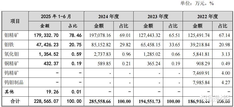 2022年-2025年1-6月,钼精矿和钼铁销售收入合计占主营业务收入的比例分别为88.12%、99.15%、98.83%和99.21%。