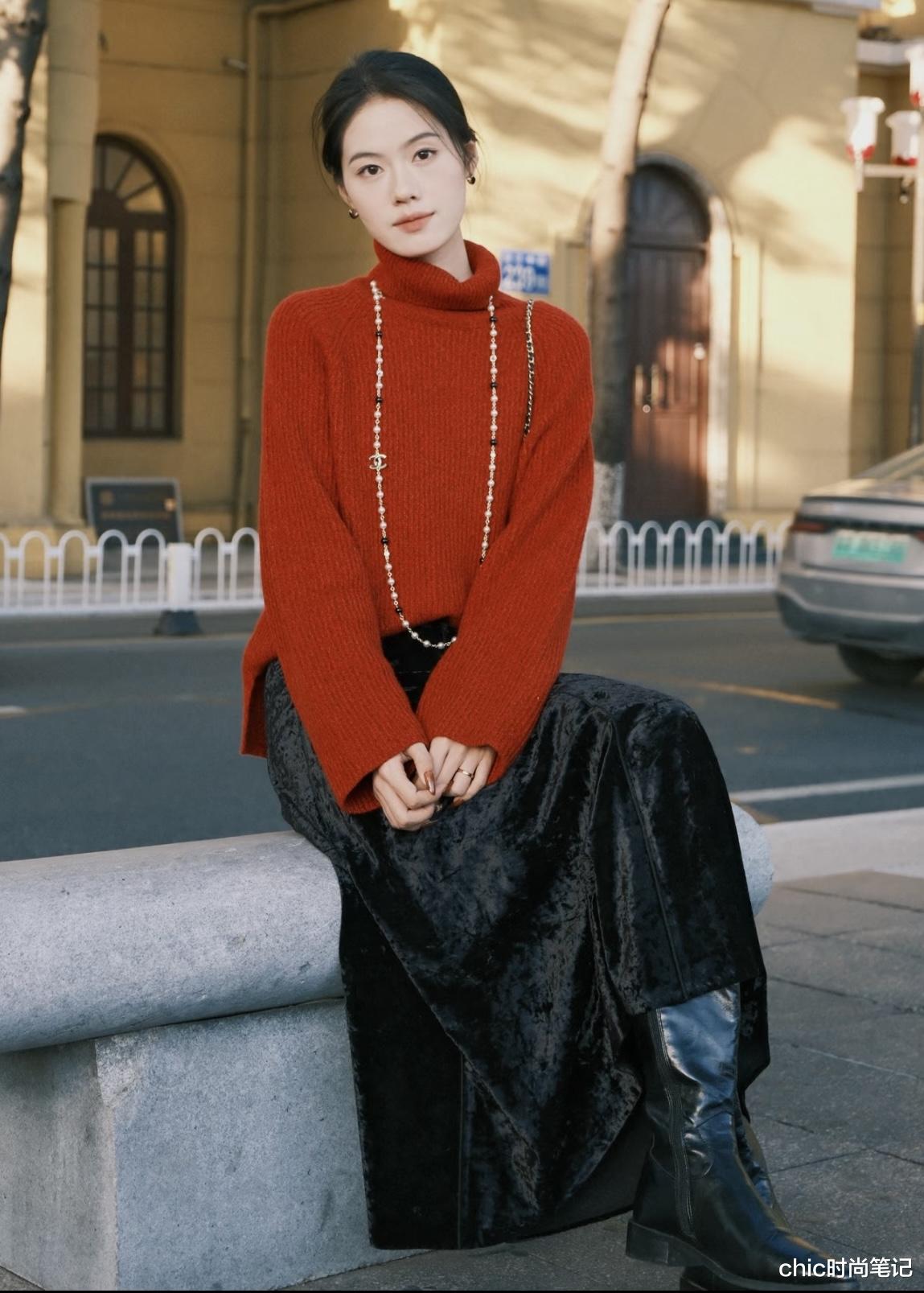 纯白色羊绒上衣搭配酒红色针织半身裙,很有秋冬的氛围感,搭配红色羊绒围巾,保暖又温柔,妥妥的温婉女主穿搭。