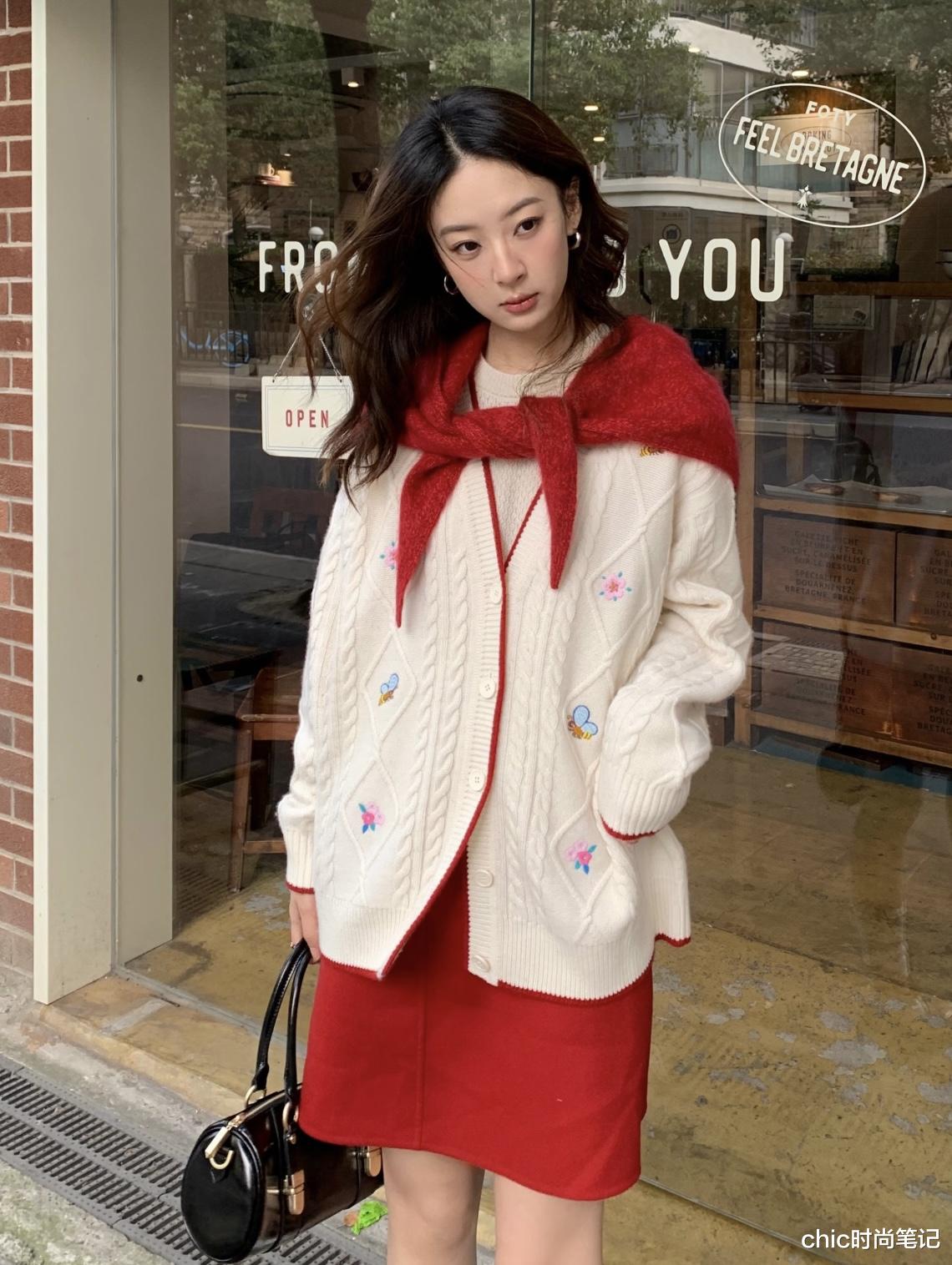 针织毛衣是氛围感穿搭的必备单品,米白色针织毛衣做了红色毛边的设计,自带圣诞气息,搭配同色系的红色半身裙和红色小坎肩,小坎肩是今年很流行的配饰,超俏皮。