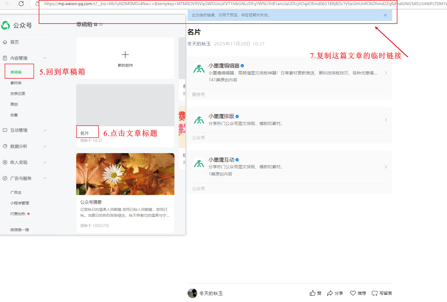 “啊!原来是要这个链接!” 那一刻,真有种醍醐灌顶的感觉。原来秘密藏在这里!是这篇包含了名片的草稿文章本身的预览链接!