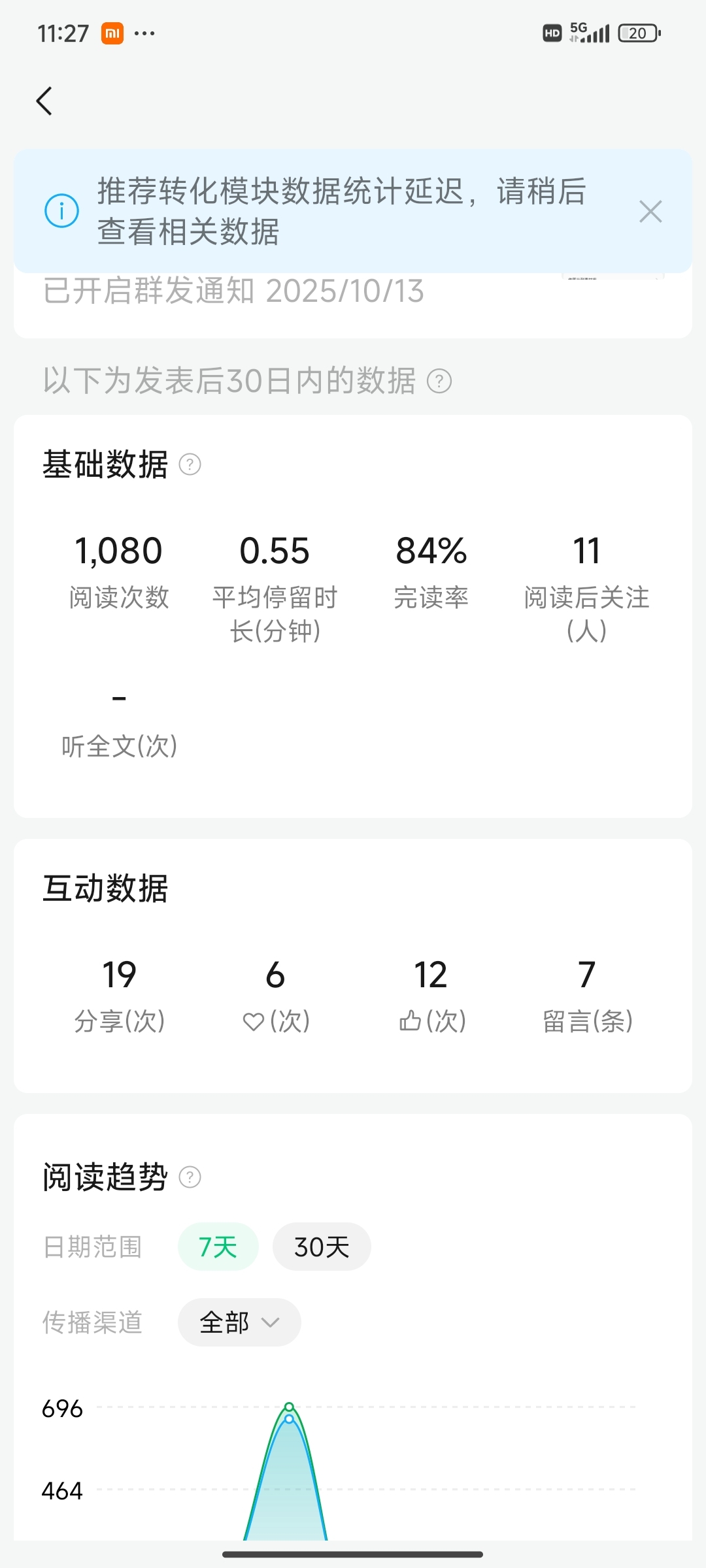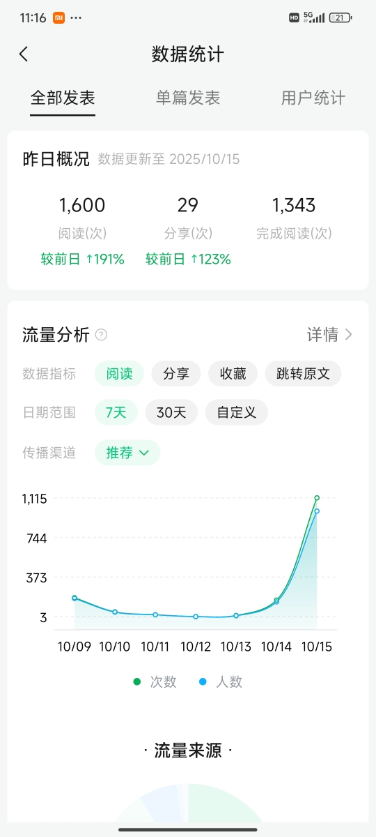 大家可以看到,截止到2025年10月16日,我的自媒体文章最近7天的推荐来源从0开始逐步恢复到1000以上,再加上其他渠道入口昨日整体文章的阅读次数是1600。