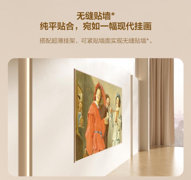 39.9mm的机身薄如精装书,无缝贴墙时宛若一幅天然生长的画;浅胡桃木纹边框温润如艺术品,背部的星空纹理与隐藏集线设计,连侧面视角都经得起审视。