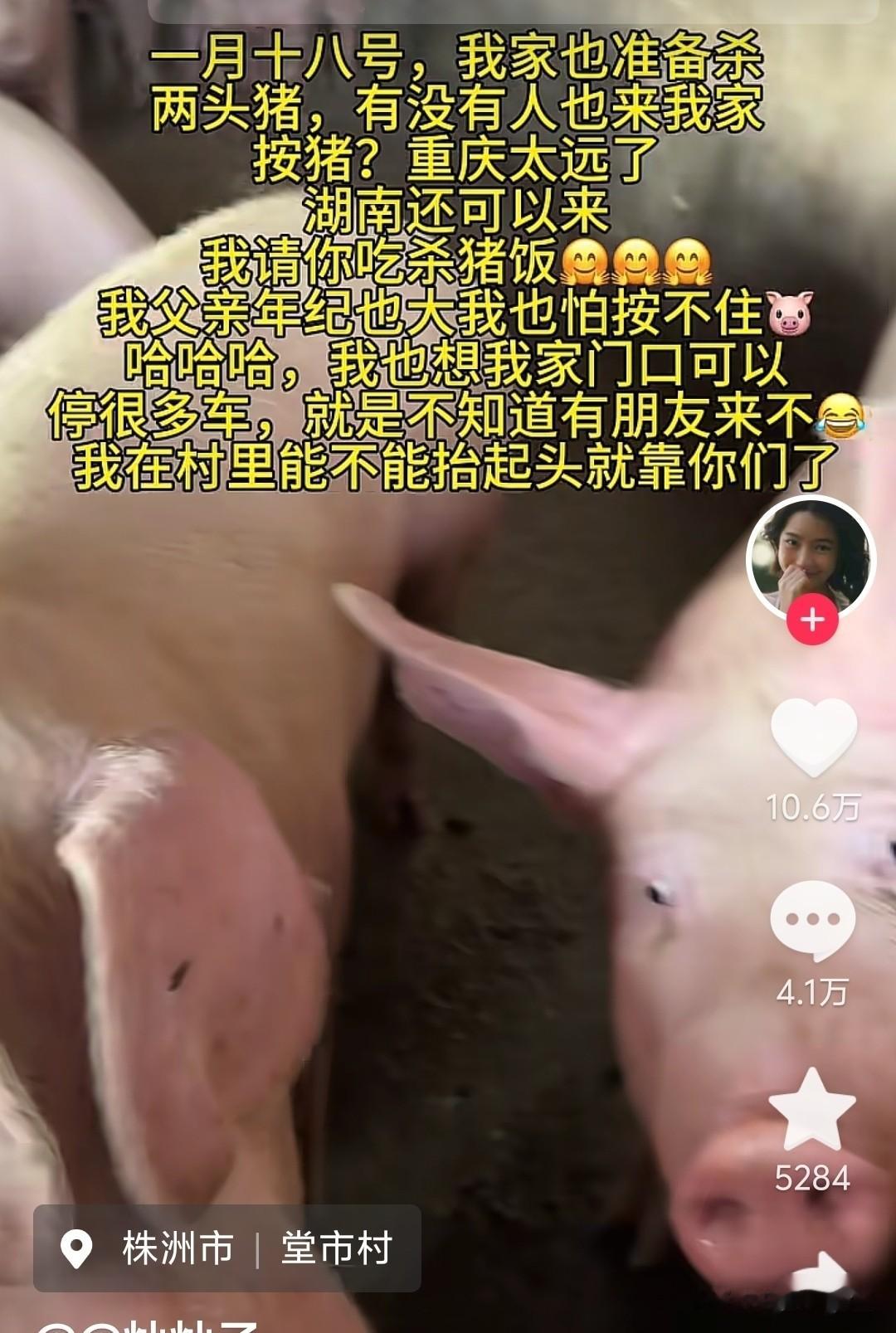 面对重庆呆呆的一夜走爆火,远在湖南株洲的灿灿,通过呆呆直播间也看到了,她非常羡慕,于是,她灵机一动,也模仿呆呆于1月11日发了一条视频,视频称:1月18号,我家也准备杀两头猪,有没有人也来我家帮忙按猪?重庆太远了,湖南还可以来,我请你们吃刨猪饭,我父亲年纪也大了,我也按不住猪,我也想我家门口停很多车,不知道有没朋友来不?我在村里能不能抬起头就靠你们了!
