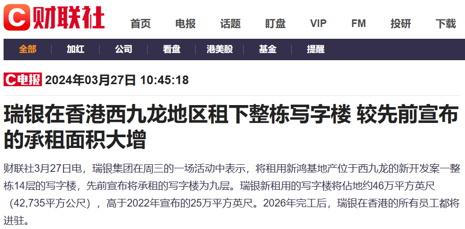 值得注意的是,目前瑞银香港总部位于港岛中环国际金融中心二期个别楼层,且在2022年以每月428万港元续租上环李宝椿大厦7层楼面(6.68万平方呎),租约长达四年至2026年中。