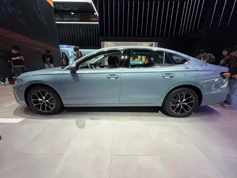 车身侧面,笔直的腰线从前翼子板贯穿至尾灯,勾勒出修长而优雅的车身轮廓。花瓣式轮圈搭配长轴距设计,让整车在静止时也充满动感俯冲的姿态。隐藏式门把手与车身同色设计,进一步强化了整体感,而车门下方微微上扬的线条,则像是在诉说它对速度的渴望。