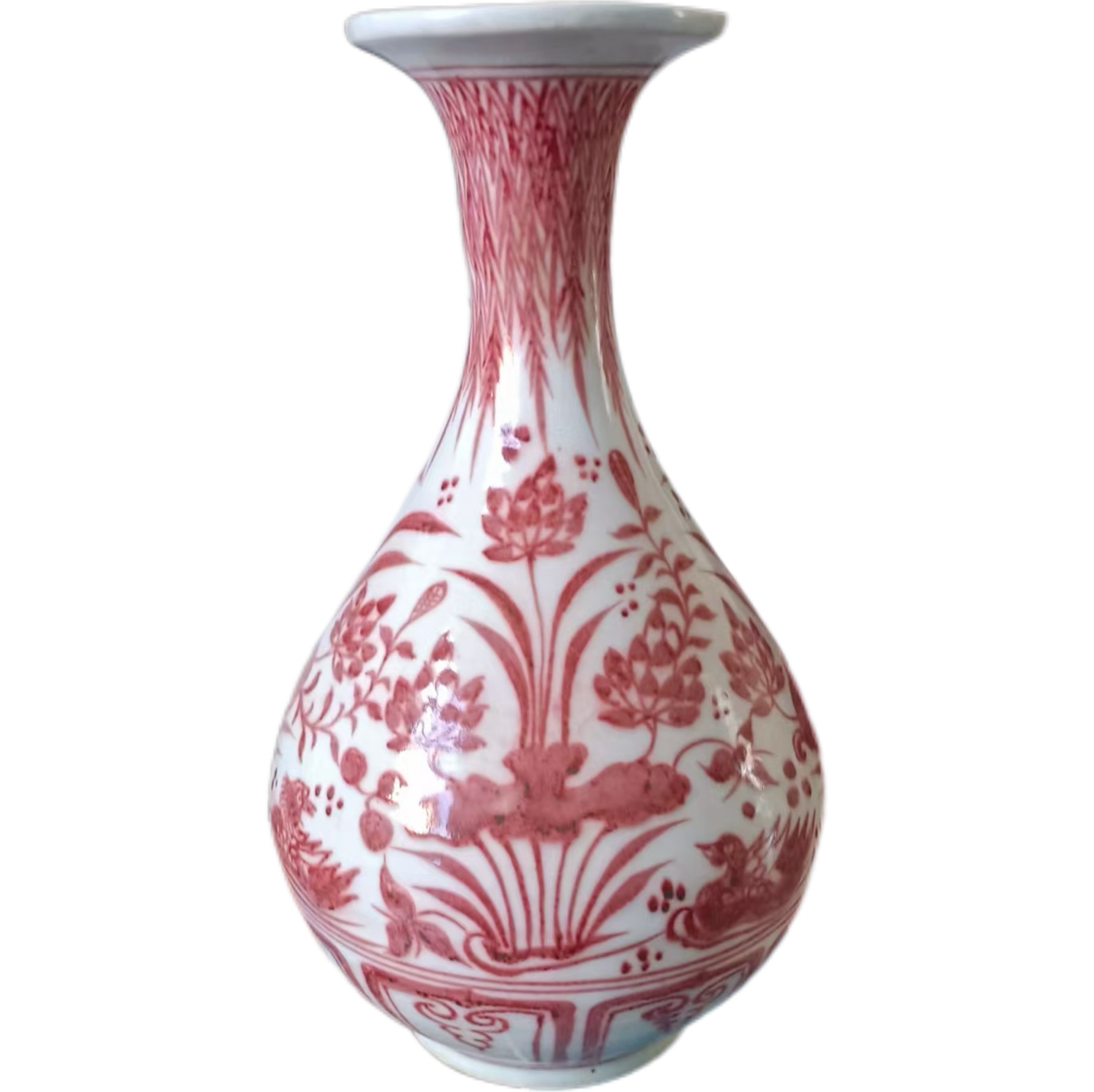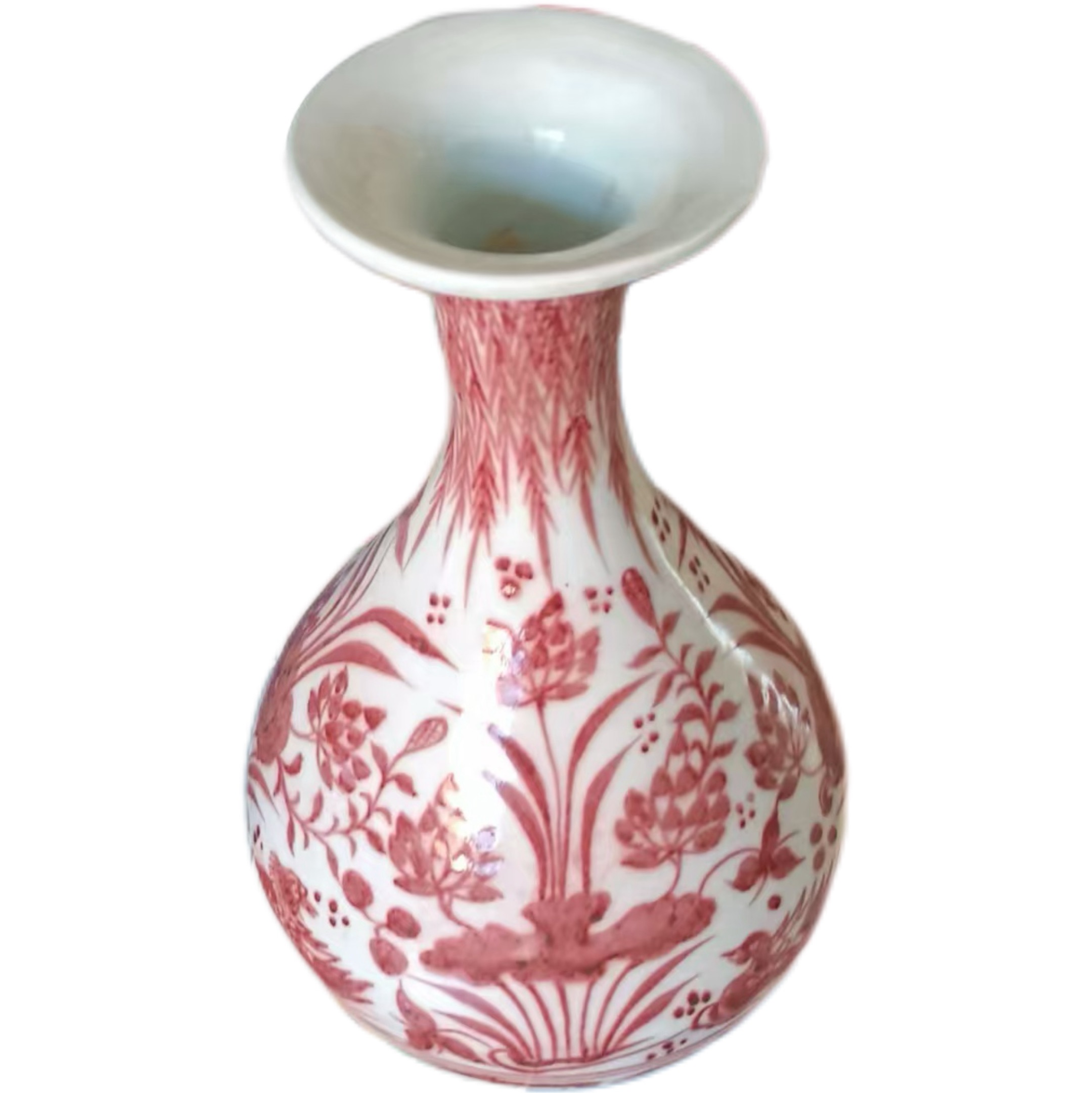 明代的玉壶春瓶,在继承宋代器型美学精髓的基础上,进行了巧妙创新。这只釉里红花卉玉壶春瓶,口沿呈喇叭状轻盈外撇,如同待放的莲花瓣,既方便观赏瓶身纹饰,又增添了器型的灵动感;颈部修长挺拔,比例协调,似美人纤颈,为纹饰布局预留了充足空间;腹部圆润饱满,如满月般富有张力,蕴含着 “圆满” 的美好寓意;圈足规整稳重,支撑起整个瓶身,使器型在灵动中不失端庄。这种器型,是对前代玉壶春瓶的传承,更是明代瓷艺在器型美学上的创新典范,将 “曲线美” 与 “实用美” 完美融合。