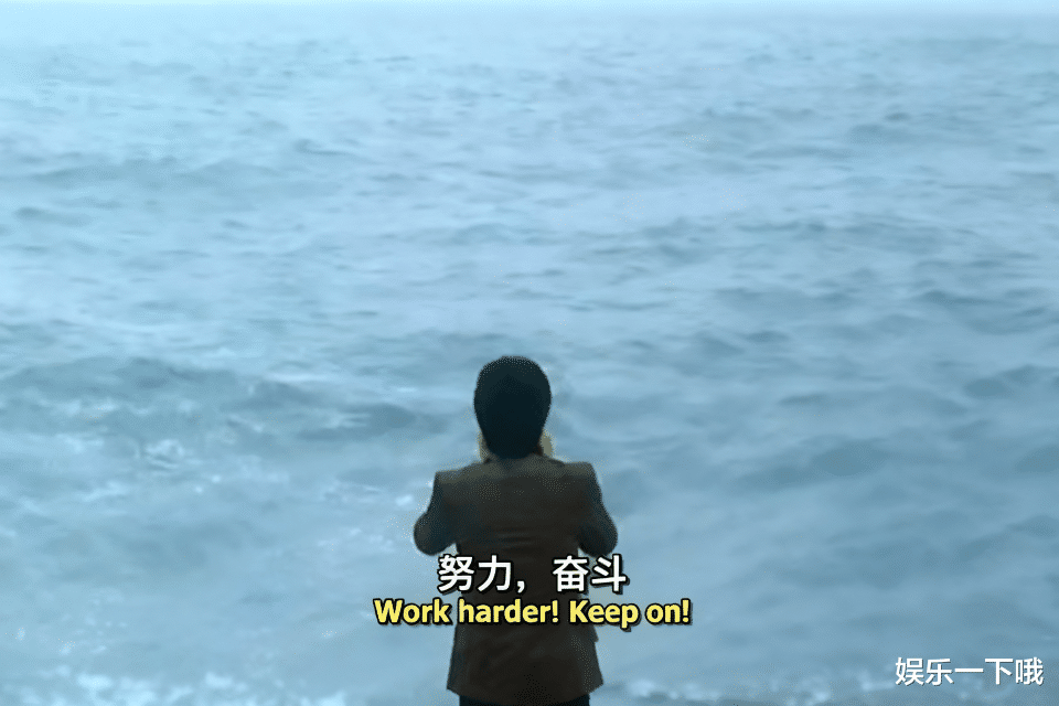 镜头没有给主角特写,而是聚焦在汹涌拍打海岸的浪花上,紧接着是一声撕心裂肺的:“努力!奋斗!”