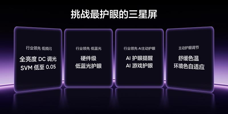 护眼方面,真我Neo8搭载全新绿野护眼系统,让这块165Hz三星苍穹屏剑指“最护眼的三星屏”。它构建了“全亮度DC调光+硬件级低蓝光+智慧护眼”体系,SVM低至0.05,接近“零频闪”,通过TÜV莱茵无频闪认证;融合AI眼疲劳守护、舒眠模式与环境色自适应,长时间用眼也更舒适;基于M14基材实现硬件级低蓝光,并搭载AI主动护眼体系覆盖全场景。