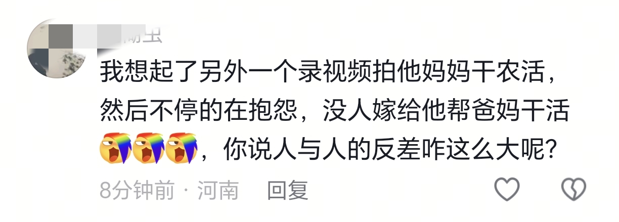 有网友说了个反面的例子:一个小伙子录视频拍他妈妈干农活,还不停的抱怨,抱怨的是没人嫁给他帮他爸妈干农活。