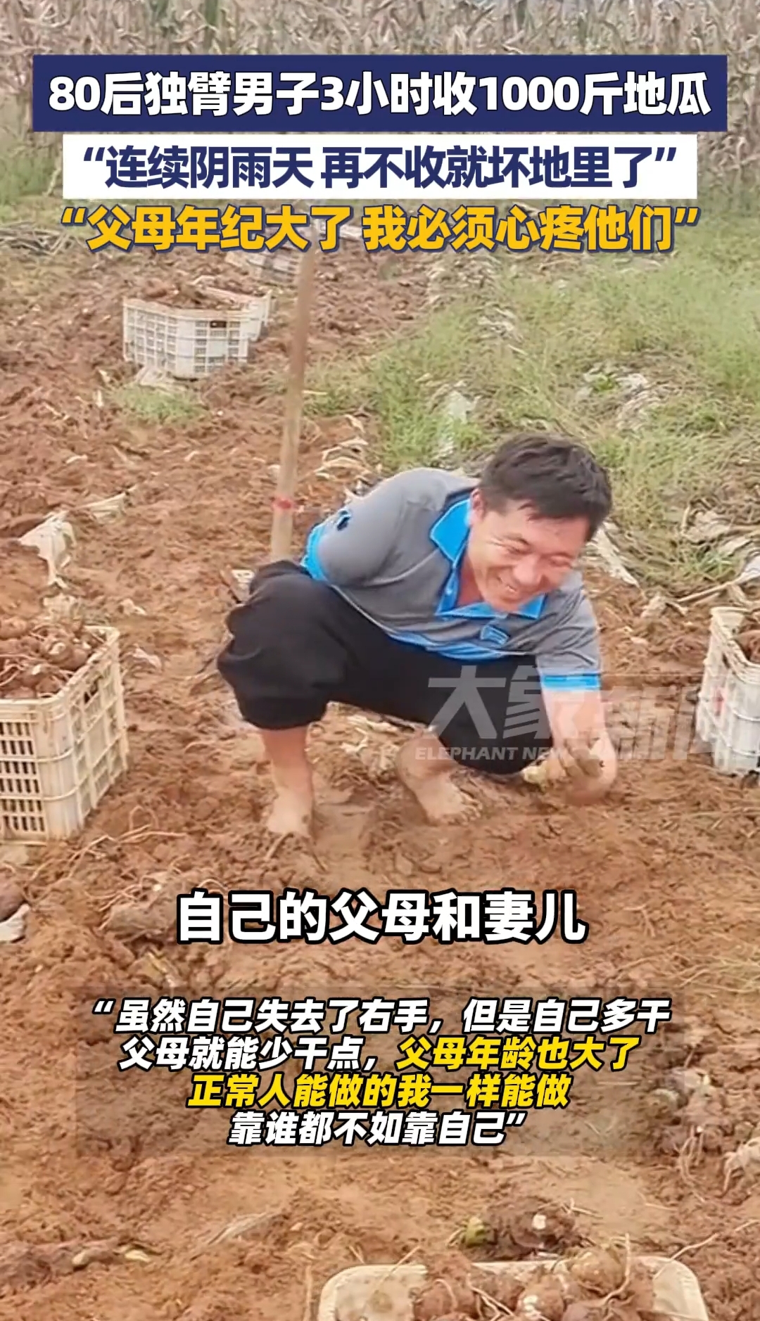 这块地瓜田,是父母种的,王先生心疼父母,就一起来地里刨地瓜了。别看他一只手,但锄头抡的飞快,他都把她母亲落下了一大截,3个小时收了1000斤地瓜。
